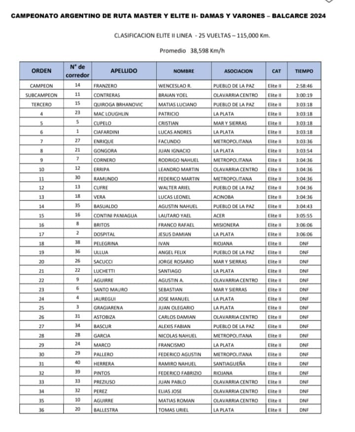 Casi 2 minutos después del campeón aparecieron Braian Contreras (Olavarría Centro) y Matías Quiroga (Pueblo de La Paz) que completaron el podio, superando en el sprint a otros 3 ciclistas que formaron parte de ese grupo que estuvo muy cerca de pelear por el oro.