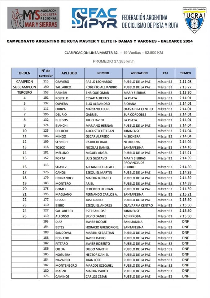 La jornada se completó con la prueba de Master B1, también sobre 82,8 kilómetros y también festejó Pueblo de La Paz, esta vez de la mano de Francisco Lassalle que se llevó el oro en 2 horas y 13 minutos.