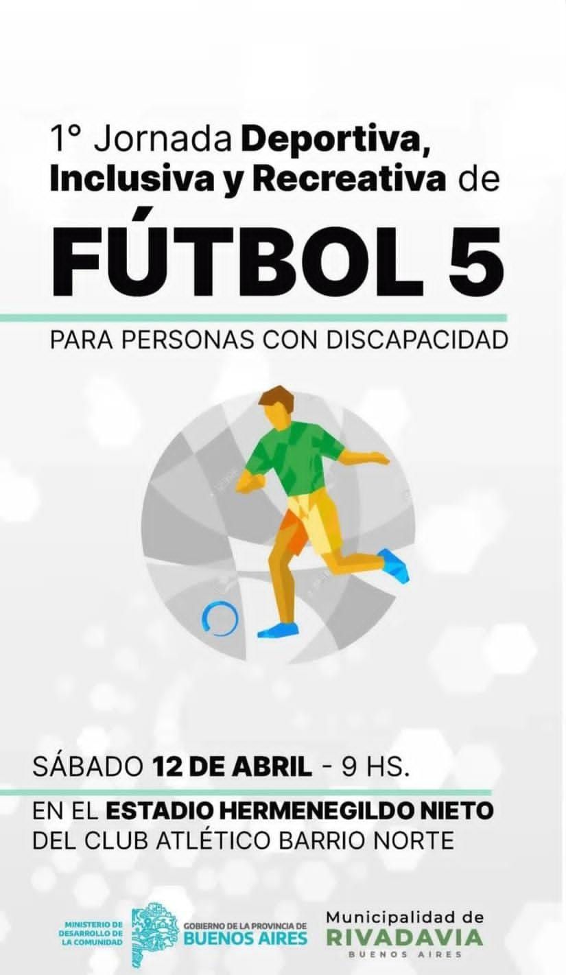 Con el objetivo de concientizar a la sociedad y contribuir a la integración de las personas con discapacidad, la Dirección de Deportes y la Dirección de Discapacidad de Rivadavia llevarán a cabo la 1º Jornada Deportiva, Inclusiva y Recreativa de Fútbol 5 para Personas con Discapacidad en América.