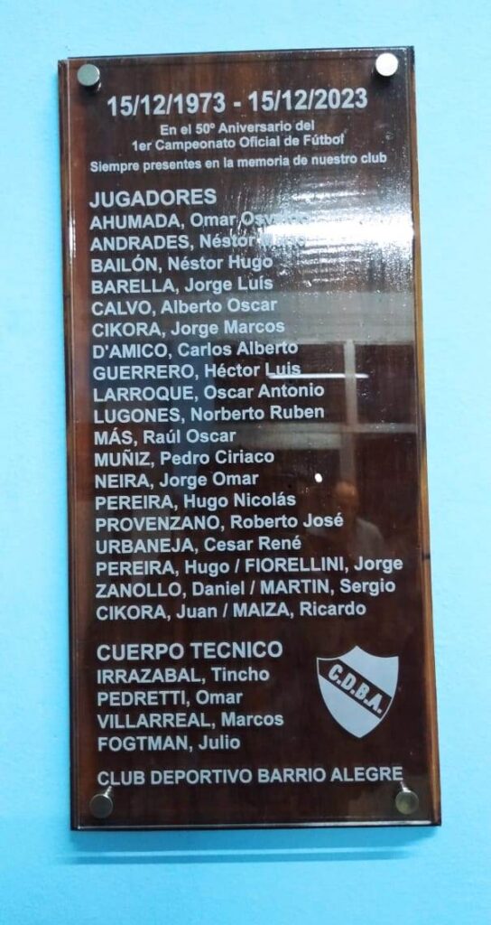 Hoy se cumplen 50 años del primer campeonato oficial del Club Deportivo Barrio Alegre. Por tal motivo a las 20:30hs se descubrio una placa conmemorativa en el sector de vestuarios del Estadio Omar Pedretti, con presencia de algunos de los protagonistas de ese plantel, familiares y dirigentes del club celeste.