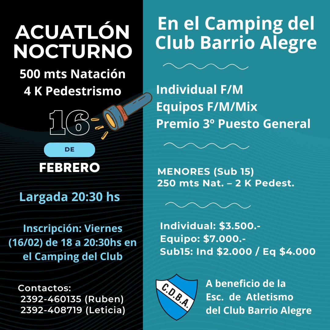 En la tarde noche de este viernes 16 se realizará en el complejo deportivo del club Barrio Alegre, la anunciada prueba de ACUATLON, que incluye competencias de natación y pedestrismo. Sera en la modalidad individual y en por equipos, con premios en disputa. La concentración y acreditación será desde las 18,30 hs en el camping del club celeste.