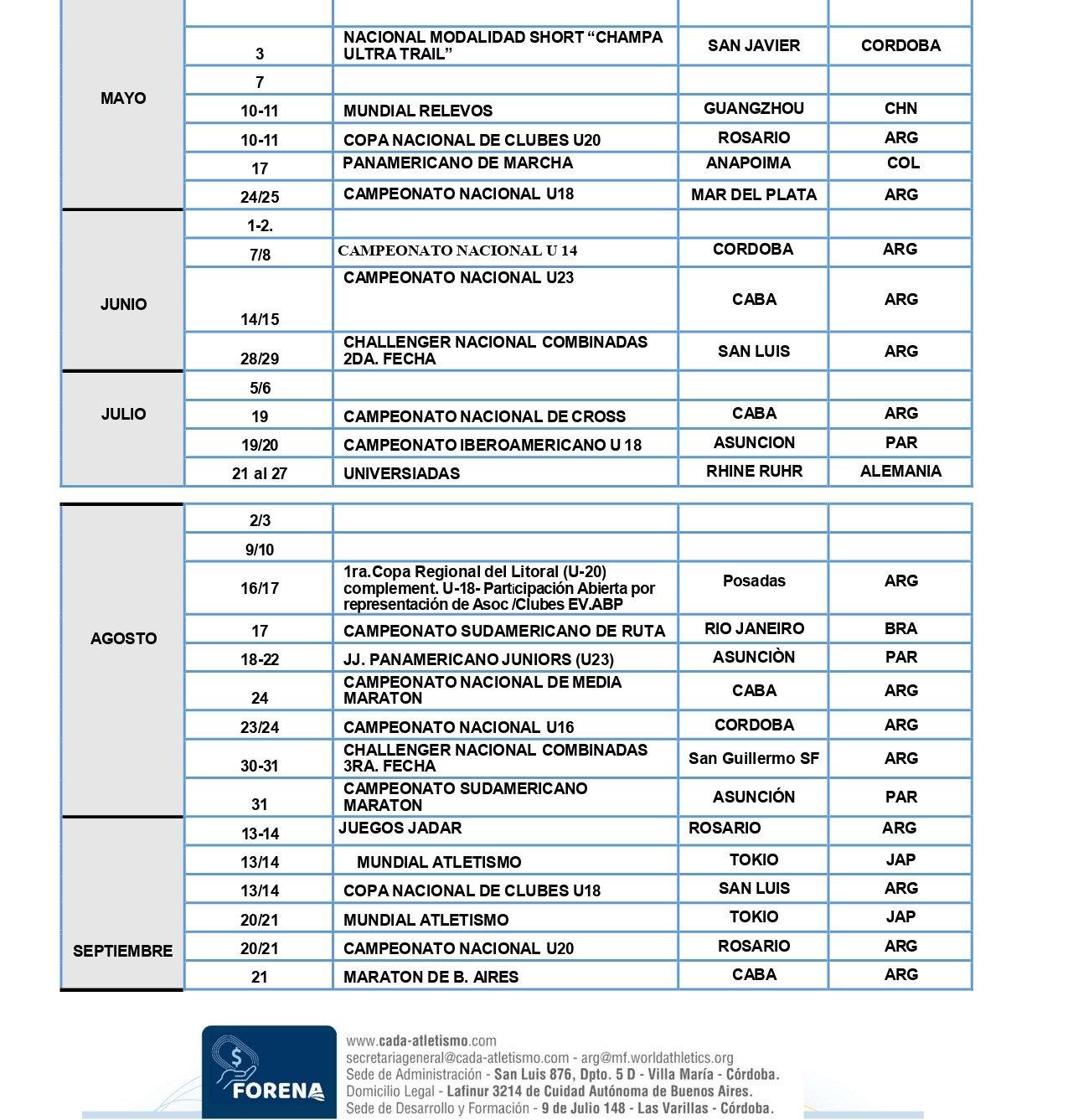 - ✅ El Campeonato Nacional de Cross Country se traslada a Termas de Río Hondo (Santiago del Estero), con fecha 13 de julio.