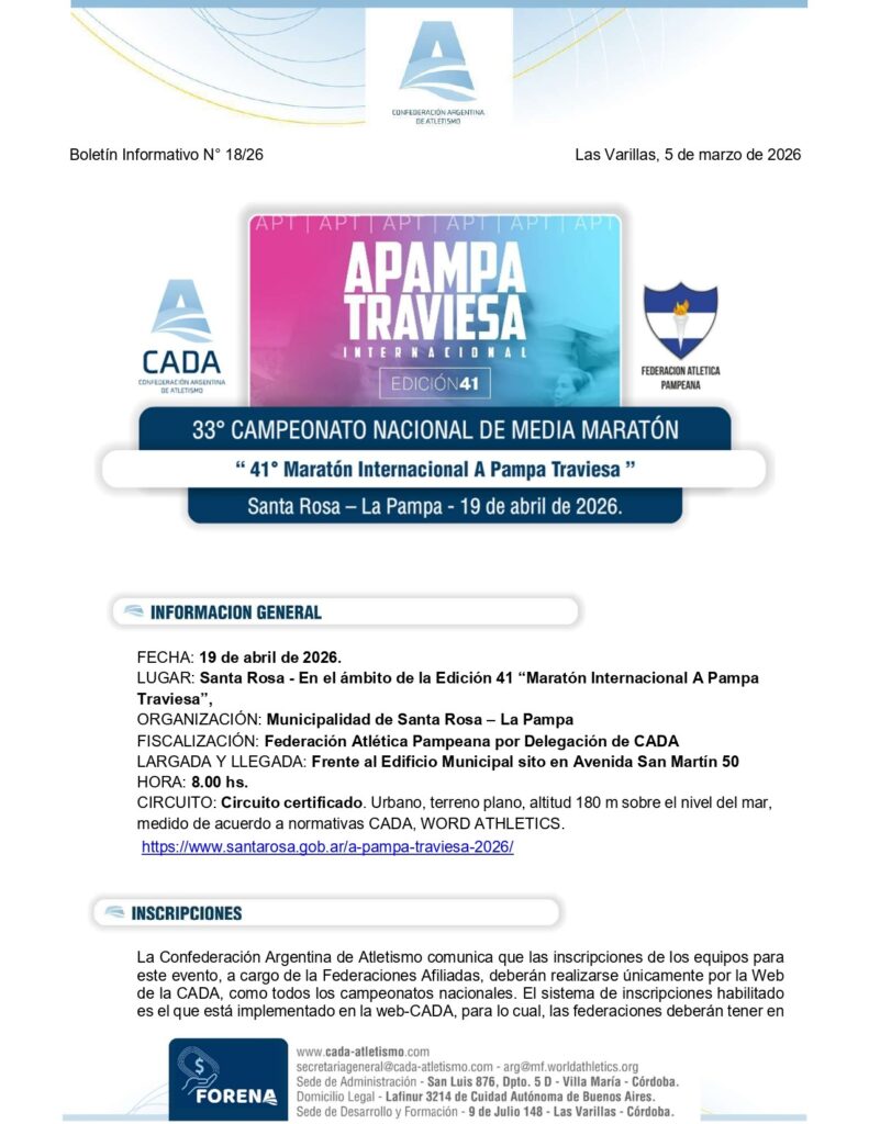 ATLETISMO FONDO A PAMPA TRAVIESA 2026 YA TE PODES INSCRIBIR A LA MARATON A PAMPA TRAVIESA. UN CLASICO DEL ATLETISMO NACIONAL. ++++++++++ AUSPICIO DE
