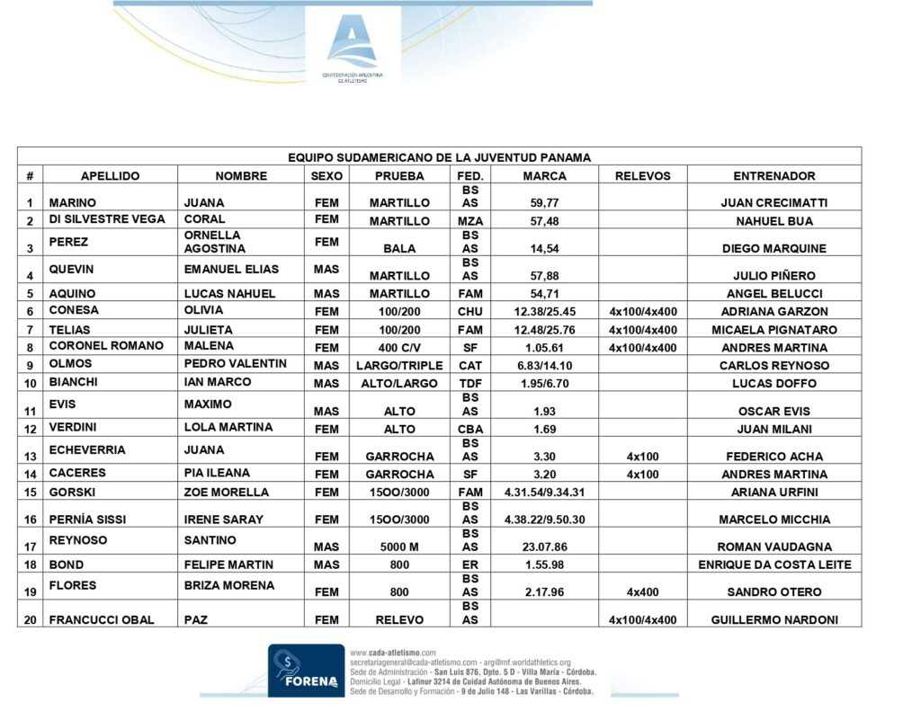 El equipo incluye a varias de las promesas surgidas en los últimos tiempos como la velocista chubutense Olivia Conesa (viene de establecer el récord de la categoría en los 100 metros llanos con 11.69) y las mediofondistas Irene Pernía y Zoe Gorski, quienes ya lucieron en otras competencias internacionales como el Ibero sub 18 de Asunción.