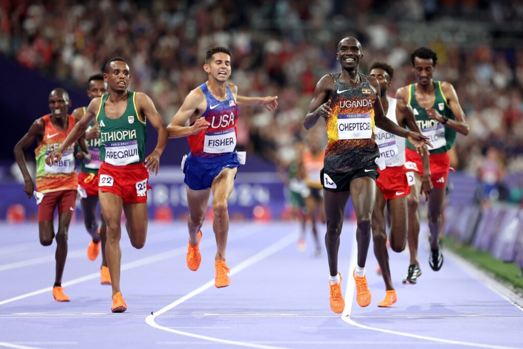 El ugandés se alejó y Fisher se quedó a unos pasos de distancia. Aregawi llegó corriendo por la recta final y alcanzó a Fisher en los tramos finales para quedarse con la plata. Sin embargo, no hubo forma de alcanzar a Cheptegei, que cruzó la línea de meta con un tiempo récord olímpico de 26:43.14, en los JJOO París 2024.