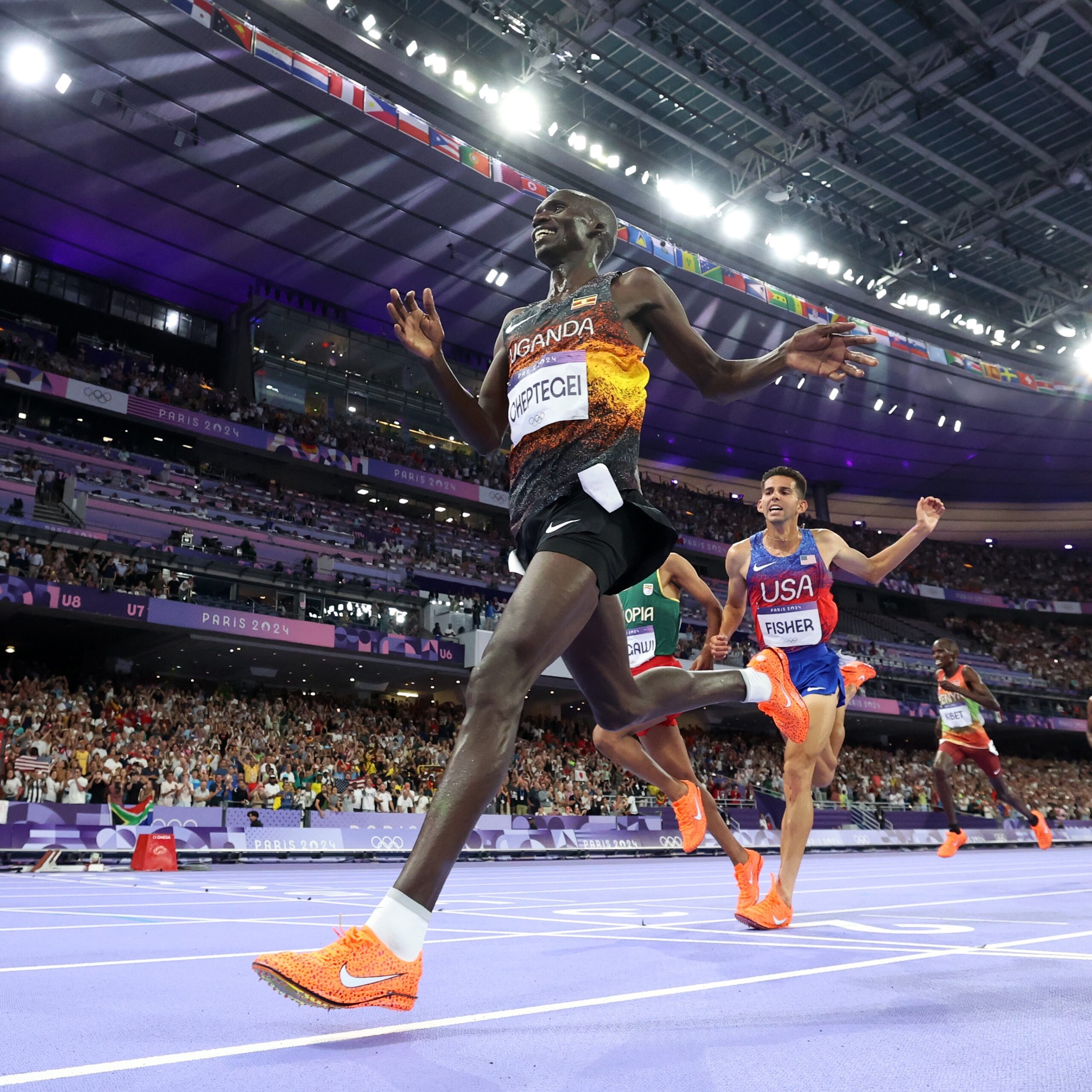 El ugandés se alejó y Fisher se quedó a unos pasos de distancia. Aregawi llegó corriendo por la recta final y alcanzó a Fisher en los tramos finales para quedarse con la plata. Sin embargo, no hubo forma de alcanzar a Cheptegei, que cruzó la línea de meta con un tiempo récord olímpico de 26:43.14, en los JJOO París 2024.