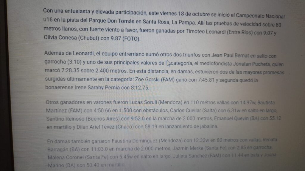 Un récord nacional y dos récords de los campeonatos fue el saldo técnico de los Nacionales de Cadetes, que finalizaron hoy en Santa Rosa, La Pampa. El récord nacional y uno del torneo lo consiguió ayer Zoé Gorski en los 2400 metros y hoy, su escolta en las 6 vueltas a la pista, Irene Saray Pernía, registró el otro récord del torneo al ganar los 600 metros en 1:37.24. En la jornada clausura también lograron mejores marcas nacionales del año el salteño Enrique Guaymas (14,07 metros en bala); la santafesina Malena Coronel (45.91 en 295 metros con vallas); la bonaerense Camila Tello (39,49 metros en disco) y los mendocinos Joaquín Videla (23.29 en 200 metros con viento a favor de 1,9 m/s) y Lucas Soruli (42.03 en 295 metros vallas). Completaron el cuadro de ganadores, en varones, el catamarqueño Pedro Olmos (13,00 metros en triple); el entrerriano Jonatan Pucheta (1:25.27 en 600 metros); el bonaerense Máximo Evis (1,83 metros en alto) y los metropolitanos Lucas Aquino (47,09 metros en disco) y Marco de Luca (4.795 puntos en el octathlon). Entre las mujeres, triunfaron la chubutense Olivia Conesa (25.80 en 200 metros con viento a favor de 2,4 m/s); la santafesina Elisa Muñoz Negri (10,51 metros en triple) y las cordobesas Lola Verdini (1,60 metros en alto) y Bianca Araya Díaz (3.304 puntos en el hextathlon). En la pista mixta 8×200 metros triunfó la Federación Metropolitana con un crono de 3:25.51. El equipo porteño estuvo integrado por, Santiago Amarillo, Stefanía Oblak, Bautista Benítez, Maia Sánchez, Joaquín Chutchurru, Felicitas Oblak, Santino Ravignani y Julieta Telias.