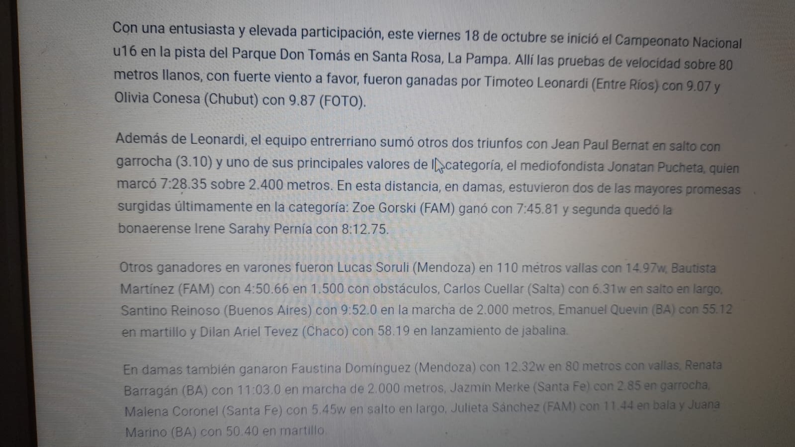 Además del récord de Gorski debemos destacar las mejores marcas nacionales del año, de la categoría sub-16, del entrerriano Jean Paul Bernat (3,10 metros en salto con garrocha), el chaqueño Dilan Ariel Tevez (58,19 metros en jabalina) y las santafesinas Jazmín Merke y Pía Ileana Cáceres (2,85 metros en garrocha).