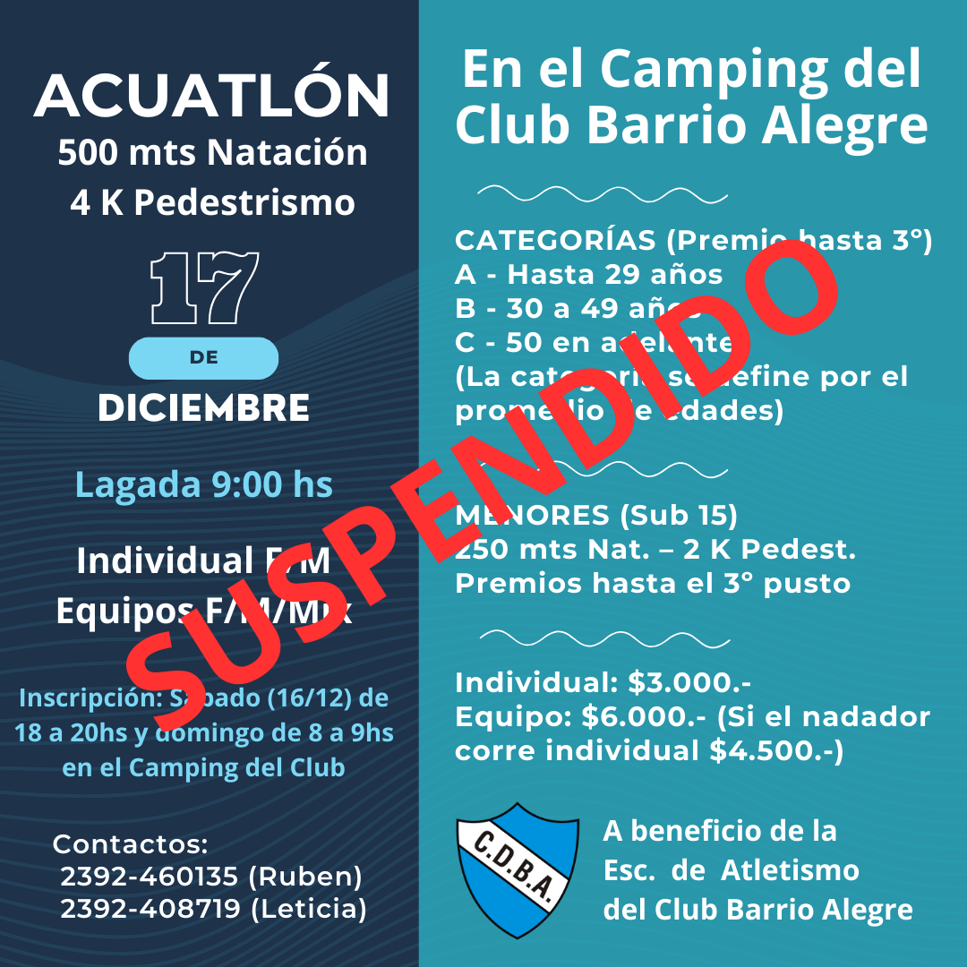 El Club Barrio alegre informa por sus redes que suspendió el Acuatlón programado para hoy 17 de diciembre.