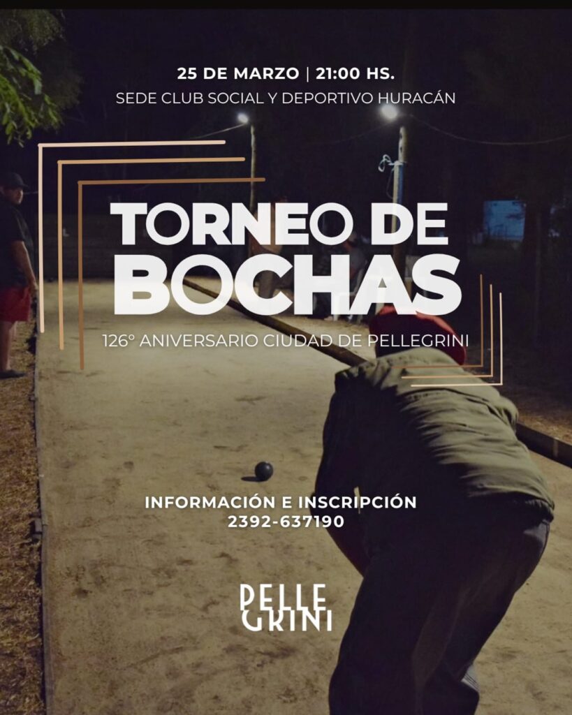 Para el próximo martes 25 de marzo se anuncia un torneo de bochas 126 aniversario ciudad de Pellegrini, a realizarse en las instalaciones del club Huracan de esa ciudad.
