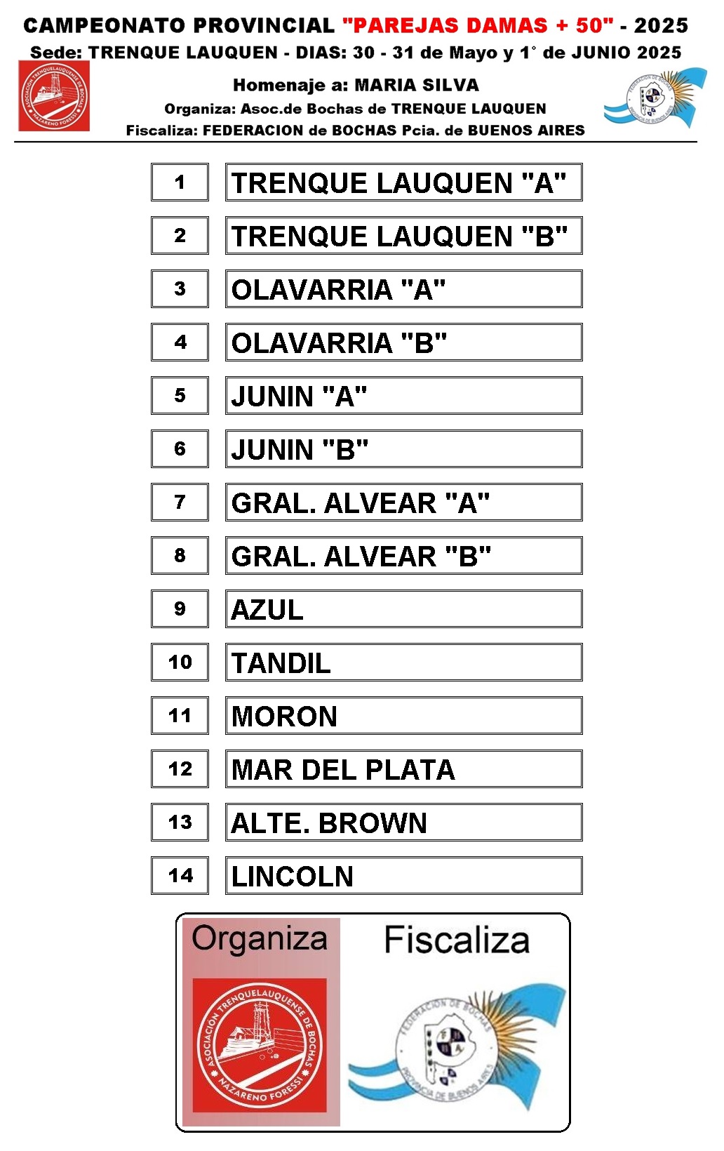 Organizado por la Asociación de Bochas Nazareno Foressi y fiscalizado por la Federación de Bochas de la Provincia de Buenos Aires, se viene realizacion del torneo provincial de damas +50 en Trenque Lauquen. Sera este fin de semana, las actividades comenzaran este jueves 29 con la llegada de las autoridades de la provincia bonaerense y se realizara una conferenca de prensa, a la 19 hs, en la sede del club Barrio Alegre.