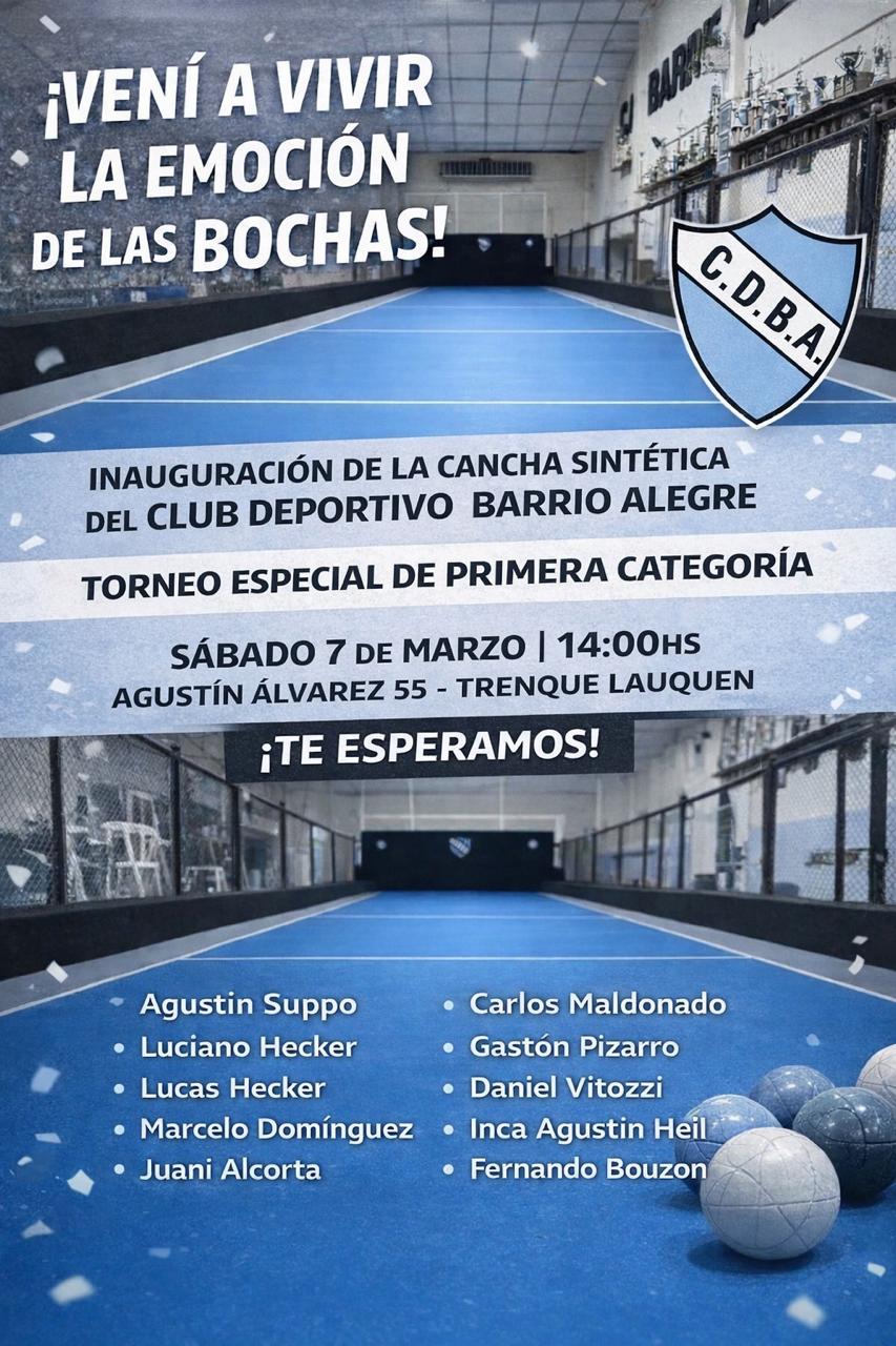 Tal como se vino informando, este próximo sábado 7 de marzo a las 10.30 hs, el Club Deportivo Barrio Alegre inaugurará el piso sintético de su Cancha de Bochas en el estadio “Nazareno Foressi” y una vez finalizado el acto, se realizará un torneo individual con ocho jugadores de distintas localidades de la Provincia de Buenos Aires.