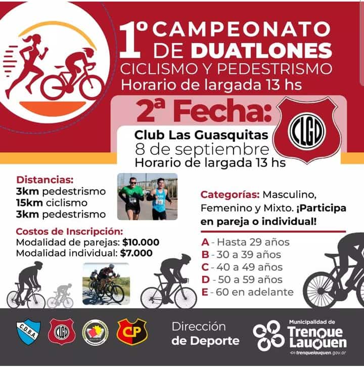 El domingo 8 de septiembre se disputará la 2º fecha del 1º Campeonato de Duatlones –Ciclismo y Pedestrismo- organizado por la dirección de Deporte municipal, los clubes Barrio Alegre, Las Guasquitas y Progreso y el Instituto Superior de Formación Docente nº 144.