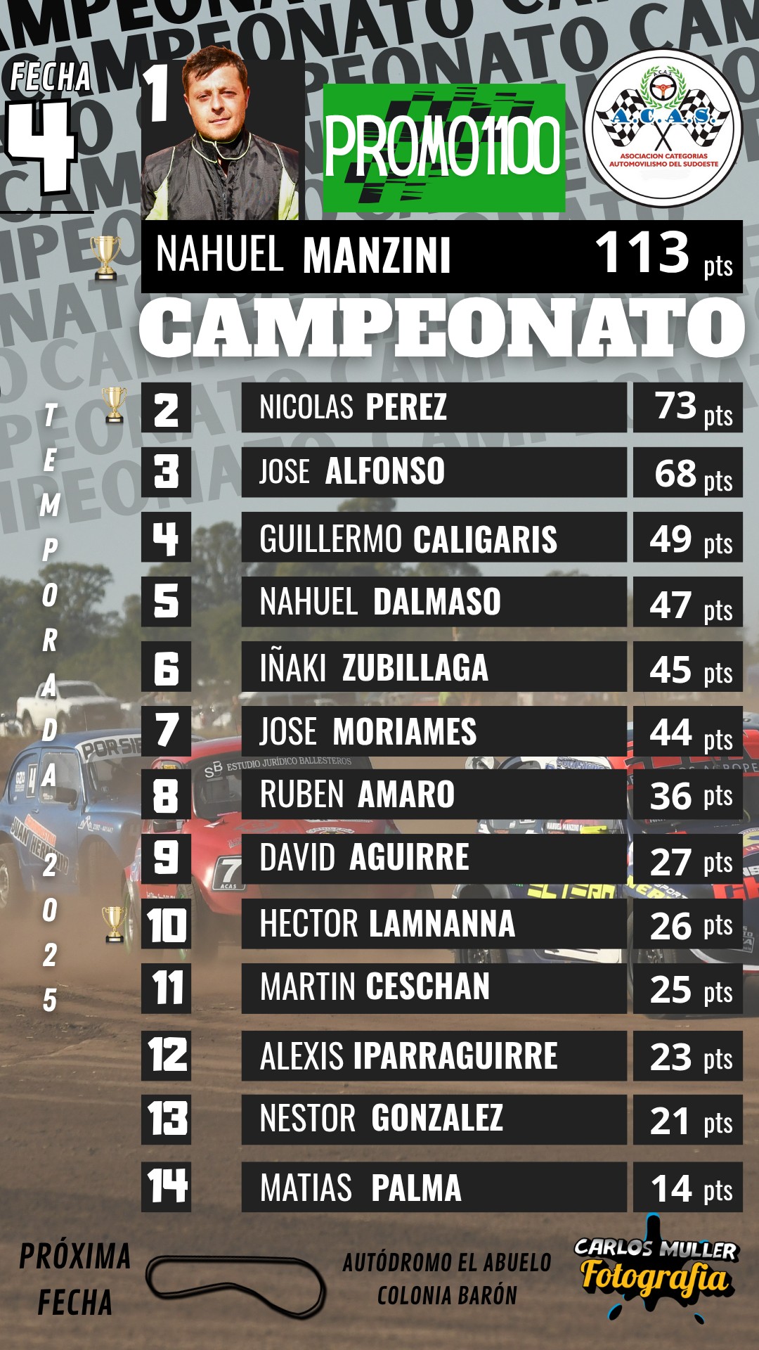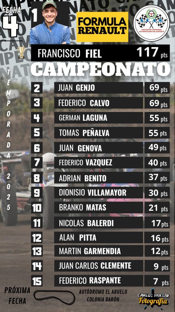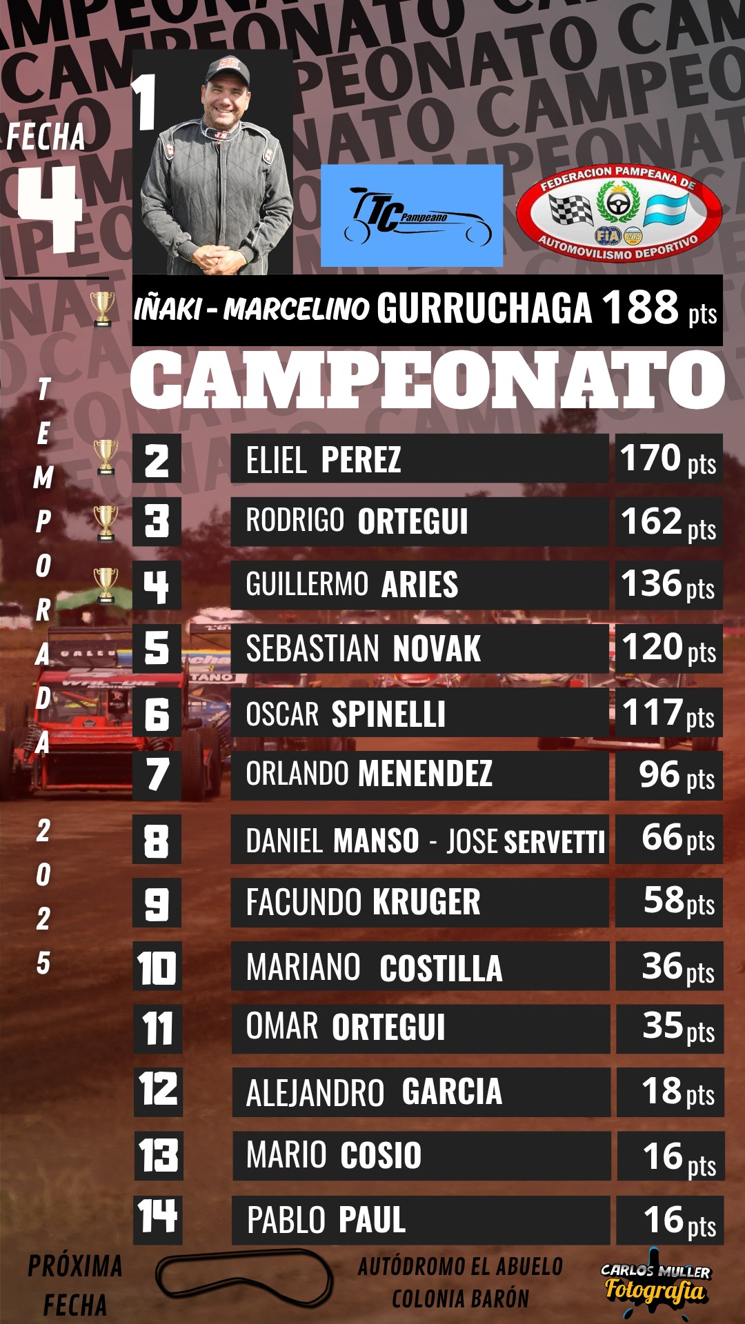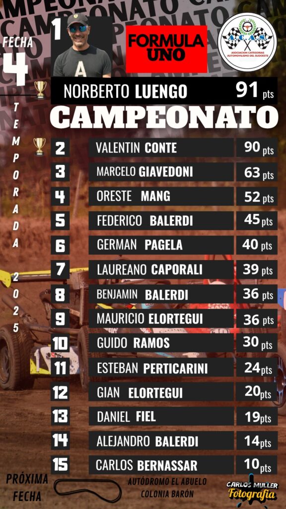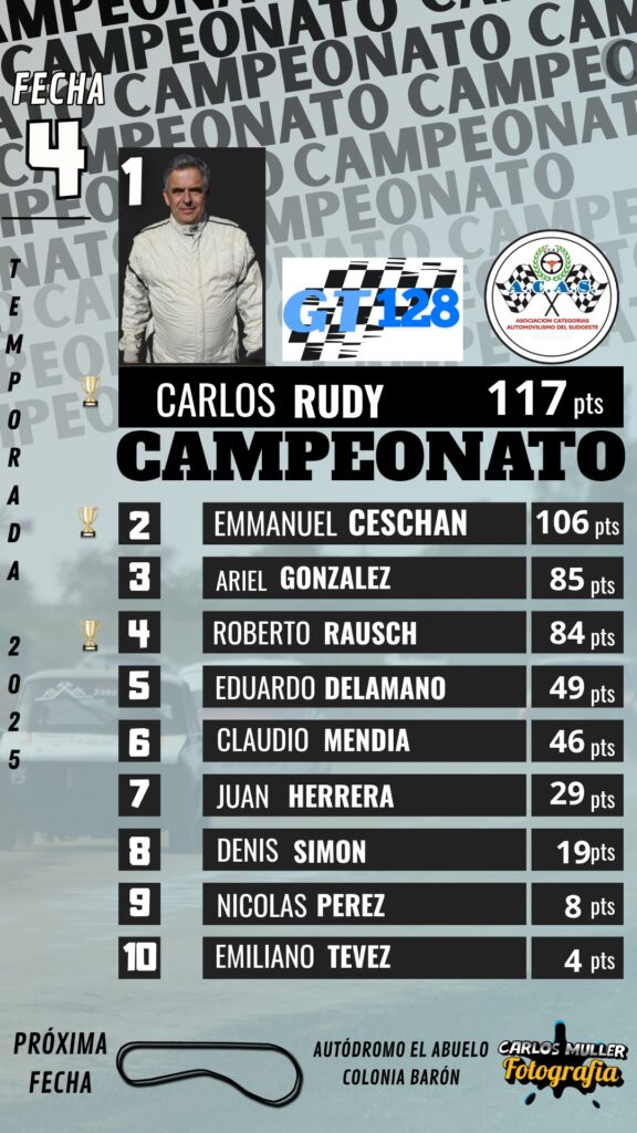 Asi estan los 5 campeonatos de cada Categoria GT 128, Promocional 1100, Formula Renault, TC Pampeano y Formula Uno.
