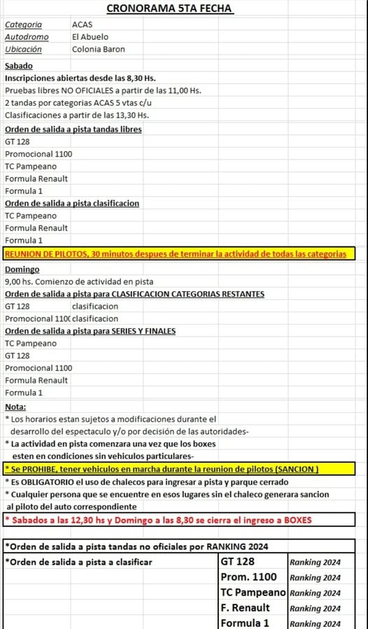 Se viene una nueva Fecha, la 5°, de esta Temporada 2025 de las Categorías ACAS. Sera el 5 y 6 de Julio en el Autodromo «El Abuelo» de Colonia Baron.