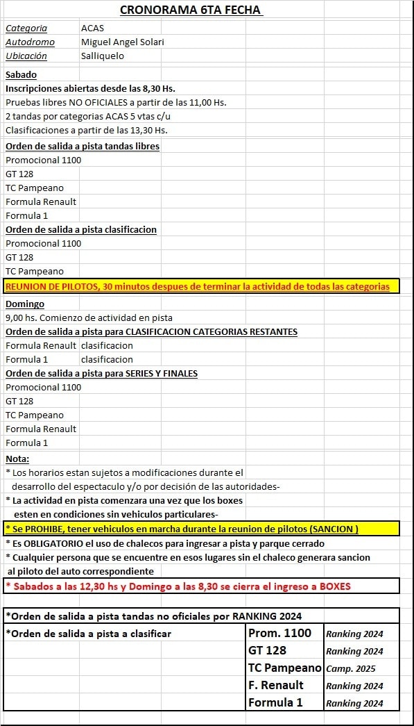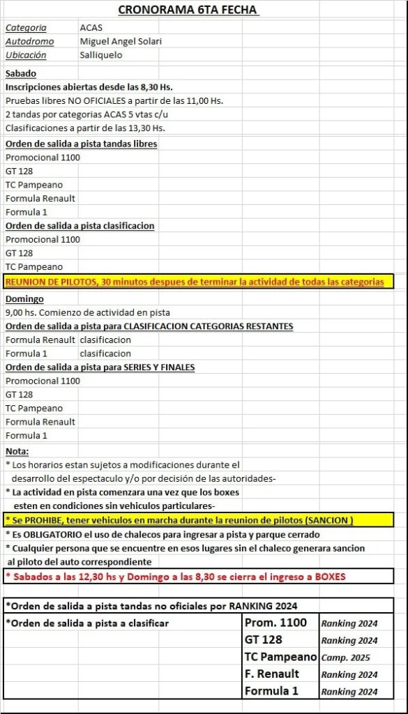 La sexta fecha del año para la Categorías ACAS se correrá este próximo fin de semana, sábado 2 y domingo 3 de agosto en la ciudad de Salliqueló. Sera con la presencia de corredores de distintas ciudades de las regionales bonaerense y La Pampa, en cinco clases. En la primera jornada habrá pruebas libres y clasificación de las clases Promocional 1100, GT 128 y TC Pampeano, en ese orden. El domingo será el turno para las clasificas de las Formula Renault y Formula Uno, y además jornada de series y finales.
