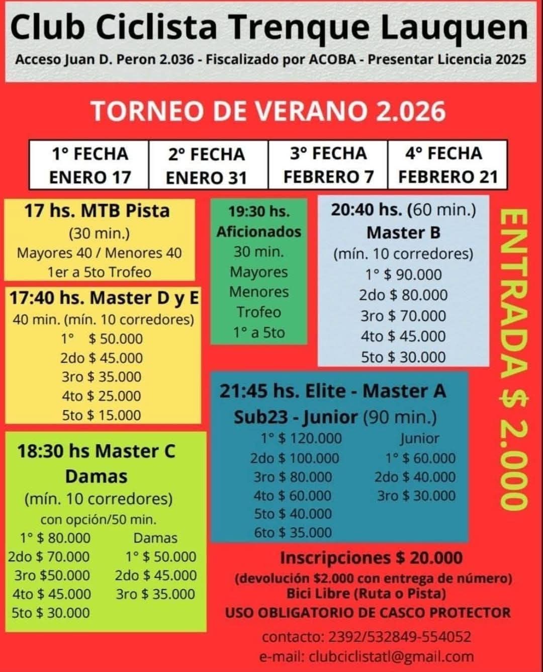 La inscripción a cada carrera tendrá un costo de $20.000 y de reintegrarán $2.000 al devolver los dorsales. Se estará cobrando una entrada al ingreso del Club de $2.000.
