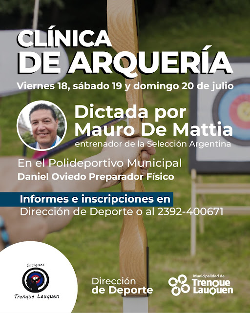 Una Clínica de Arquería, sobre Arco Recurvado Olímpico, que será dictada por Mauro de Mattía, entrenador de la Selección Argentina, se realizará desde este viernes (18) y hasta el domingo (20) en el Polideportivo Municipal “Poroto” Abásolo, organizada por la Dirección de Deporte municipal y la agrupación Caciques Trenque Lauquen.