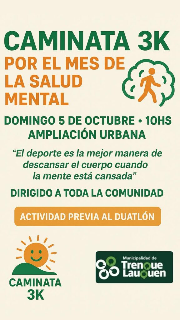 Previo a la carrera principal, desde las 10 horas, se realizará una Caminata 3K enmarcada en el Mes de la Salud Mental, abierta a toda la comunidad. Desde el área de Salud Mental del Municipio –organizadores de la iniciativa– señalaron: “El deporte es la mejor manera de descansar el cuerpo cuando la mente está cansada”. El objetivo de esta actividad es crear conciencia sobre los problemas de salud mental.