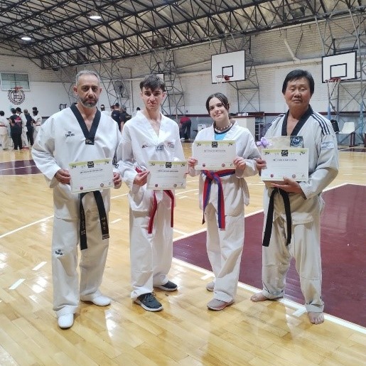 El director y profesor de la Escuela Municipal de Taekwondo Olímpico, Javier Gabio junto al presidente de la Federación Pampeana, Chon Simouang y los alumnos Martina Lambertt y Axel Ustarroz, participaron de la jornada Marcial para cinturones Rojos, Negros y Maestros.