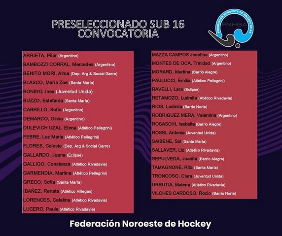 La nómina de jugadoras convocadas trabajarán a las órdenes de Luis Colman y Pedro Ribot, buscando el objetivo de ser parte del Campeonato Nacional de Hockey Sub 16 a jugarse en Bahia Blanca del 8 al 11 de agosto próximo.