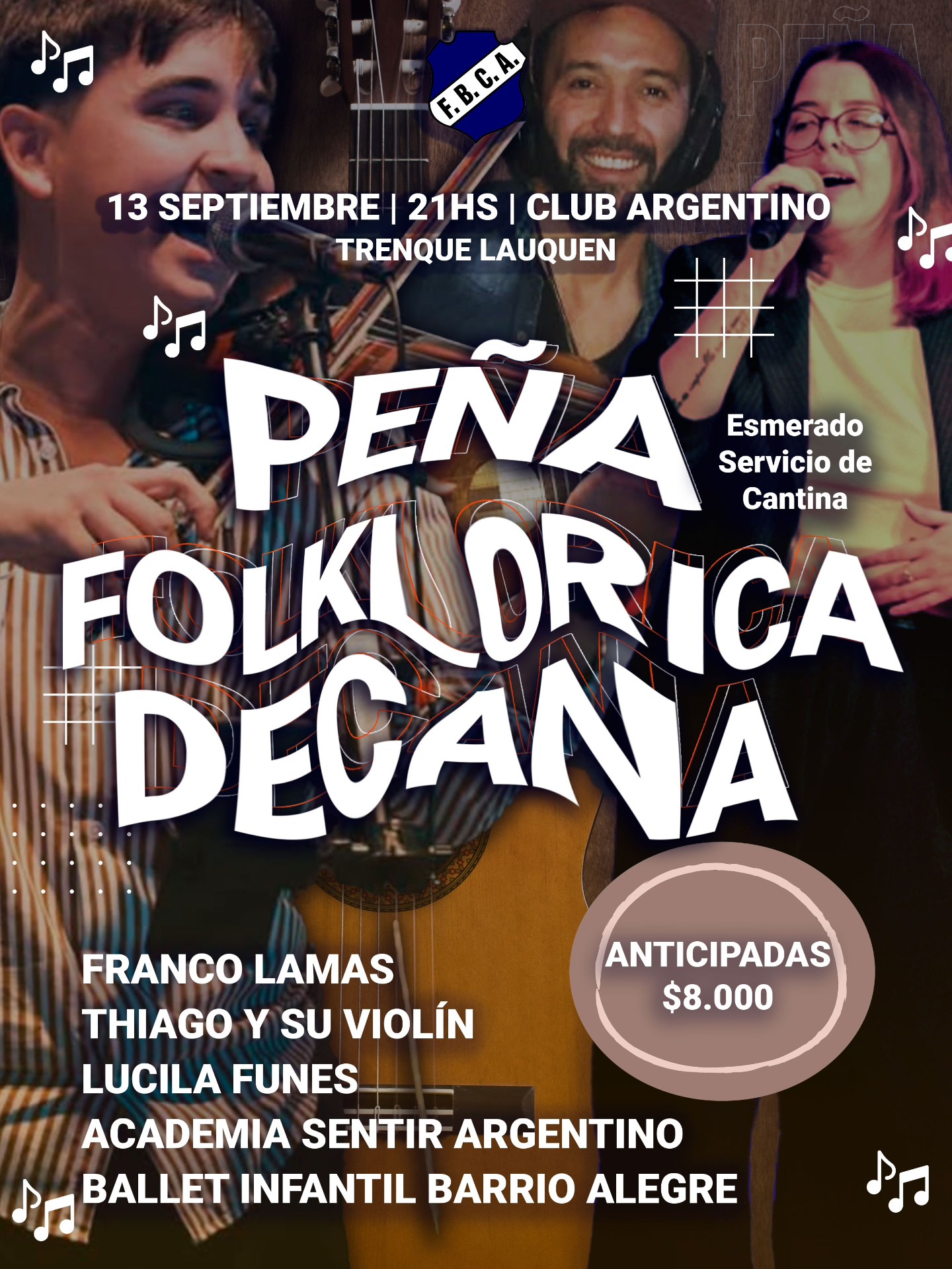 El próixmo sábado 13 de septiembre a las 21 hs, viví una noche inolvidable en la sede del club (Belgrano 546) con la gran Peña Folklórica Decana.