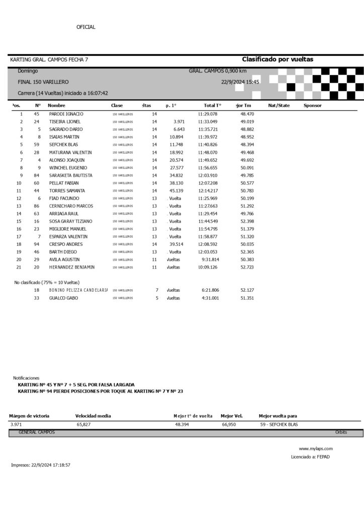 En el campeonato de los Varillero sigue liderando Lionel Tiseira, que paso a reunir 212 puntos, escoltado por Valentín Maturana con 172 y tercero esta Candelaria Bonino con 90.