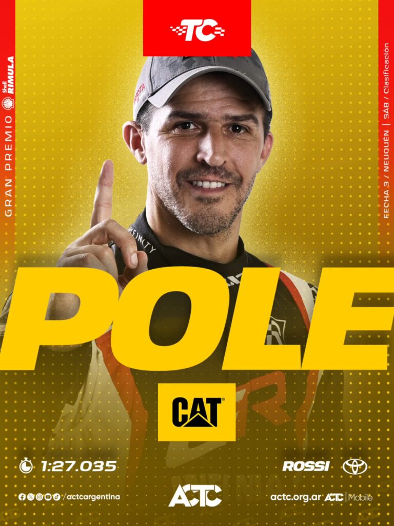 Del Viso festeja gracias a Matías Rossi, el piloto de Toyota con el Pradecon Racing, se quedó con la Pole CAT del Turismo Carretera en Neuquén con un tiempo de 1m27s035/1000. Con esta pole, llegó a la número 40 en el TC, es el que más acumula en la historia de la categoría y es la primera con el equipo luego de 18 carreras.