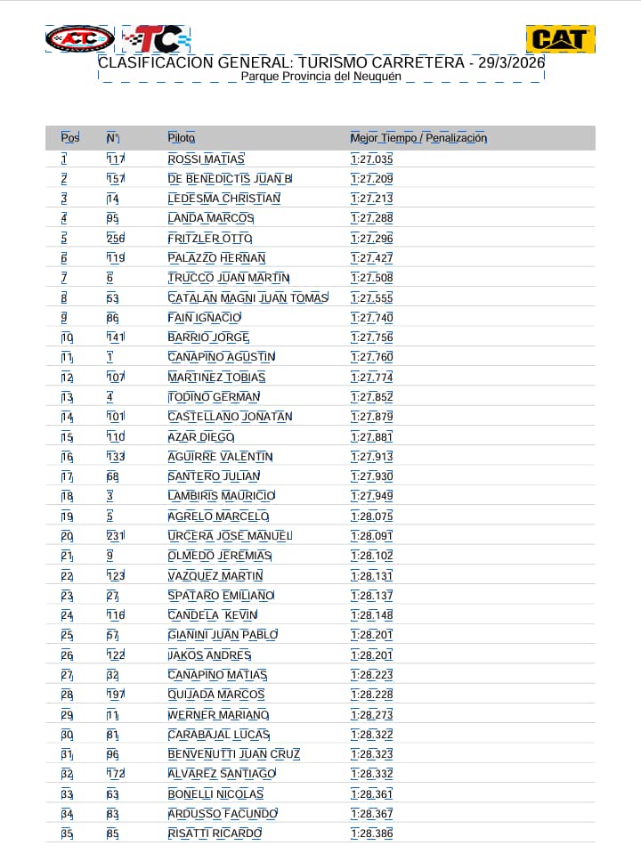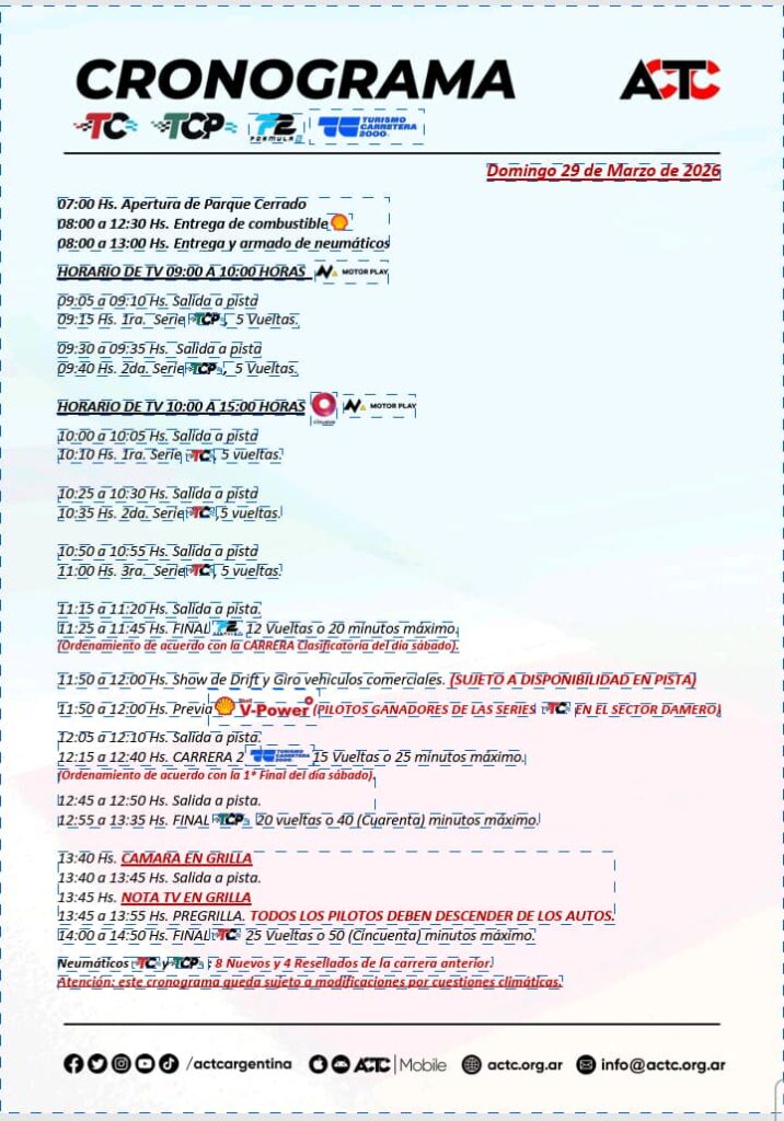 Este domingo, a las 10:05 horas se pone en marcha la primera serie, liderada por Rossi. La segunda arranca a las 10:30 con De Benedictis adelante y la tercera será a las 10:55, con Ledesma a la cabeza. Todas a 5 vueltas. La final del Gran Premio Shell Rimula por la tercera fecha del TC comienza a las 14:00 horas, a 25 vueltas o 50 minutos.