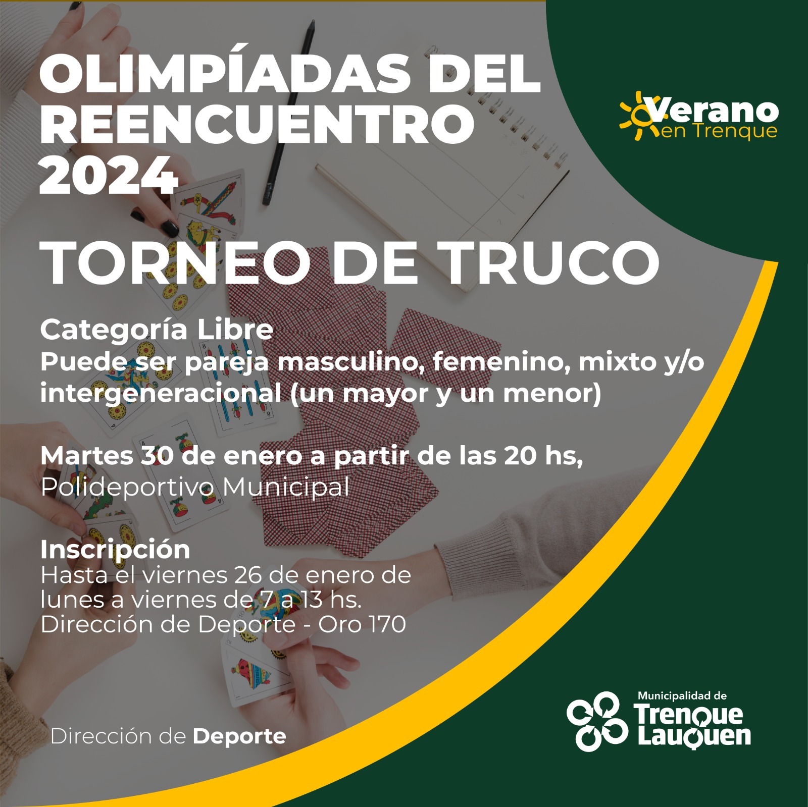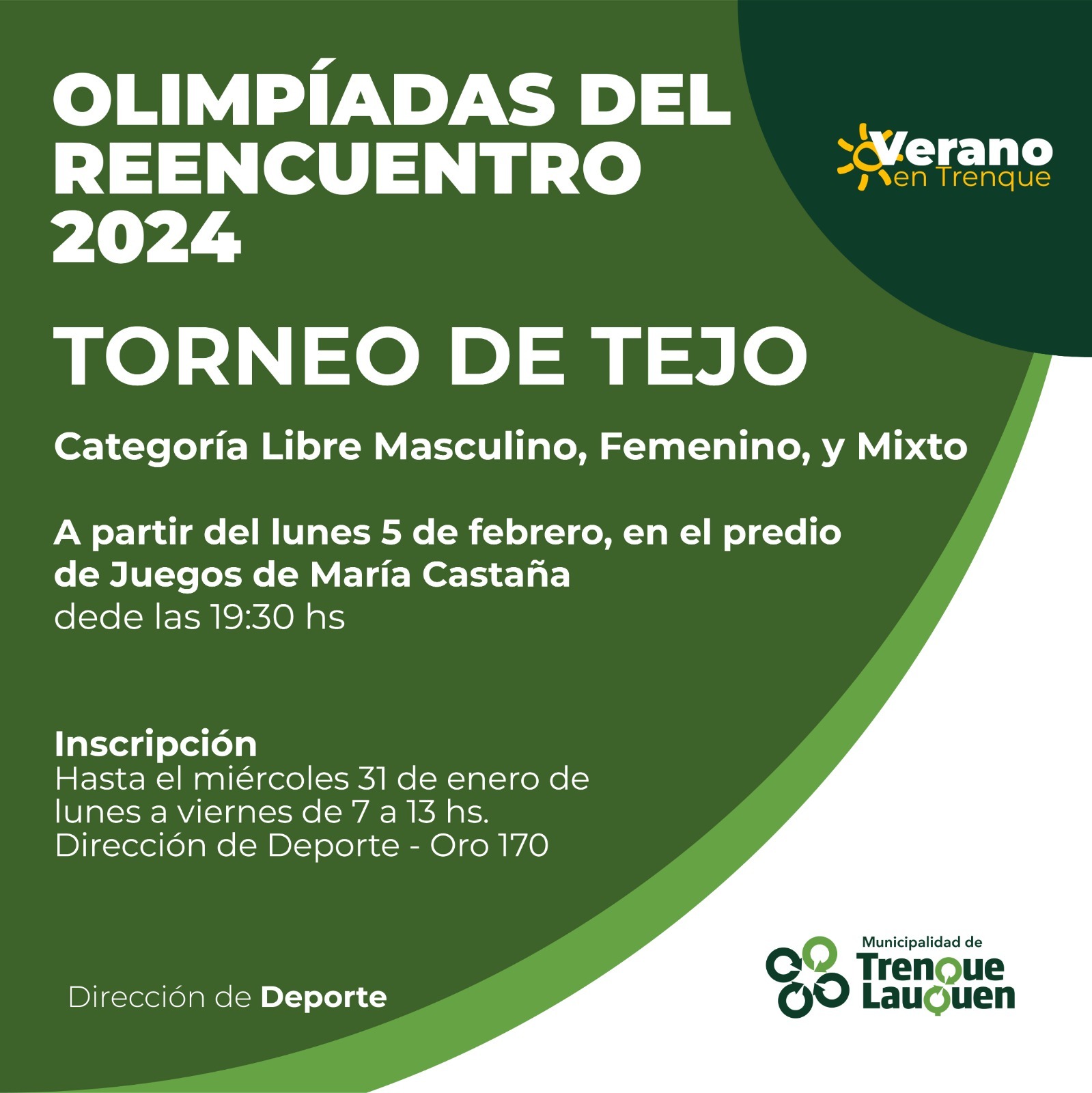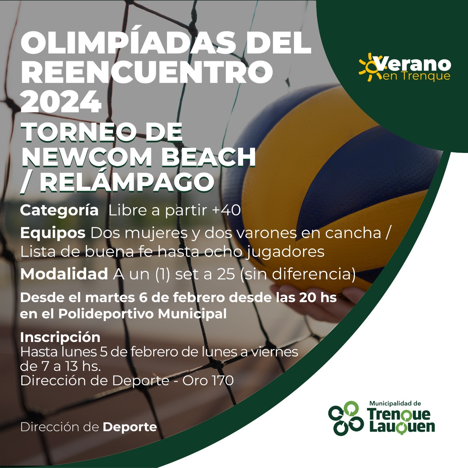 La dirección de Deporte municipal abre la inscripción a las disciplinas de Beach Fútbol con un Campeonato de Penales y a los torneos de Truco, Tejo y Newcom Beach (Relámpago), que comenzarán a disputarse desde la semana próxima y en forma escalonada durante febrero en el marco de las Olimpíadas del Reencuentro 2024 y el programa Verano en Trenque que impulsa la municipalidad de Trenque Lauquen a través de sus diversas áreas.