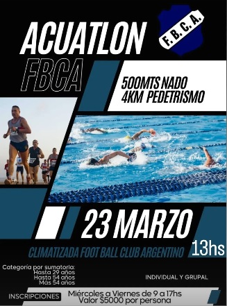 Este sábado 23 de marzo se realizará una nueva prueba de Acuatlon en Trenque Lauquen. En este caso será con una jornada organizada por el FBC Argentino, con epicentro en su sede social de la calle Belgrano. Serán 500 metros de natación, utilizándose el natatorio cerrado de la entidad y luego 4 kilómetros de pedestrismo, por la zona céntrica de la ciudad.