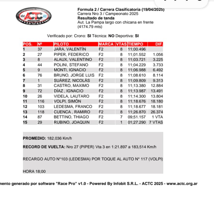 FEDE PIPER SEGUNDO EN LA CARRERA CLASIFICATORIA, TERCERO FUE VALENTINO ALAUX