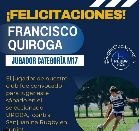 Y no podíamos cerrar la semana sin darle las FELICITACIONES a Francisco Quiroga , jugador de nuestro de nuestro Club, que fue convocado para jugar mañana Sábado en el Seleccionado de Uroba en la Categoría M17 contra Sanjuanina Rugby en Junin.