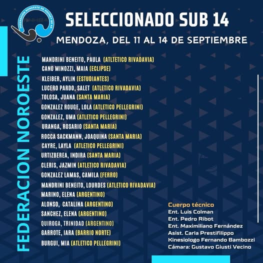 La Coordinación de Selecciones de esta Federación, dio a conocer la lista de jugadoras que del 11 al 14 de septiembre próximo, disputarán en la ciudad de Mendoza, el Campeonato Argentino de Selecciones Sub 14 “A”.