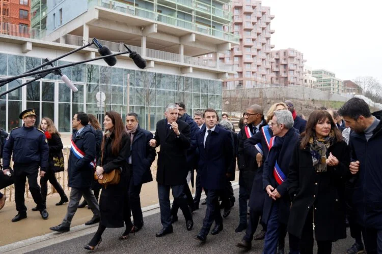 El presidente visitó las instalaciones, recorrió parte de las 52 hectáreas que se han convertido en un nuevo barrio dividido entre tres municipios del norte de la capital, en un paraje donde había una zona industrial a orillas del Sena.