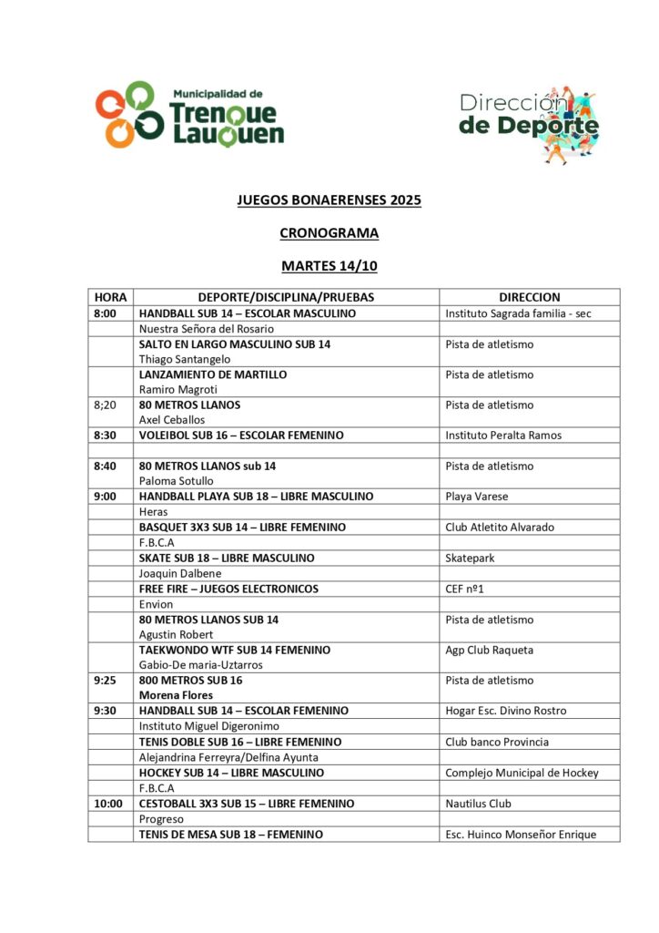 Con disciplinas como Handball, básquet 3 x 3, taekwondo, voleibol y el atletismo, este martes comenzaran a competir los equipos y deportistas del distrito de Trenque Lauquen, en la final Provincial de los Juegos Bonaerenses 2025, que se desarrollan desde este lunes 13 en Mar del Plata. A nivel atletismo comenzaran las competencias con series y algunas finales, y en lo que hace a disciplinas de conjuntos, se disputará la primera fecha de las zonas respectivas. La edición de los JB2025 se extenderán hasta el próximo sábado 18 en horas del mediodía.