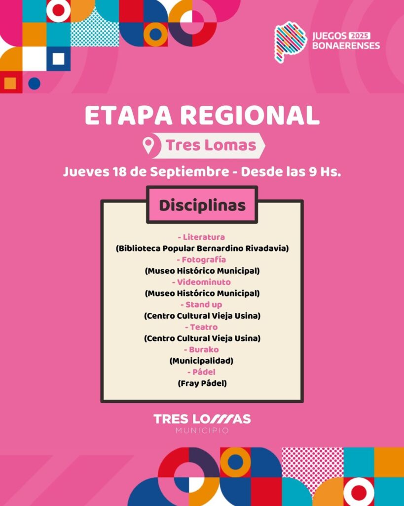 Tres Lomas cierra este jueves 18 la etapa de los regionales en Cultura, clasificatorio para la Final Provincial de los Juegos Bonaerenses 2025, a realizarse en el mes de octubre en Mar del Plata.
