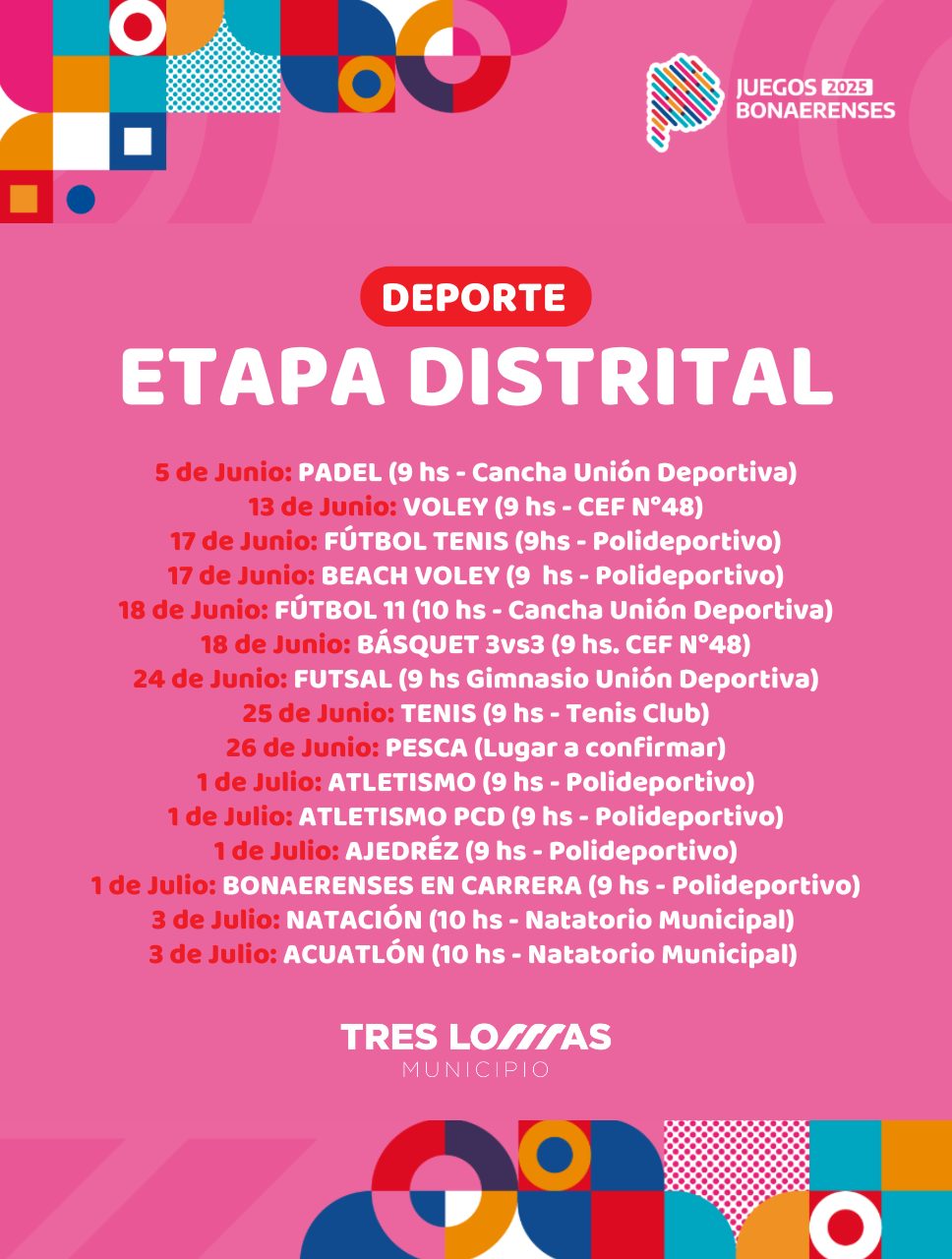 Tambien en el distrito de Tres Lomas comenzaran las eliminatorias por el Juegos Bonaerenses 2025.