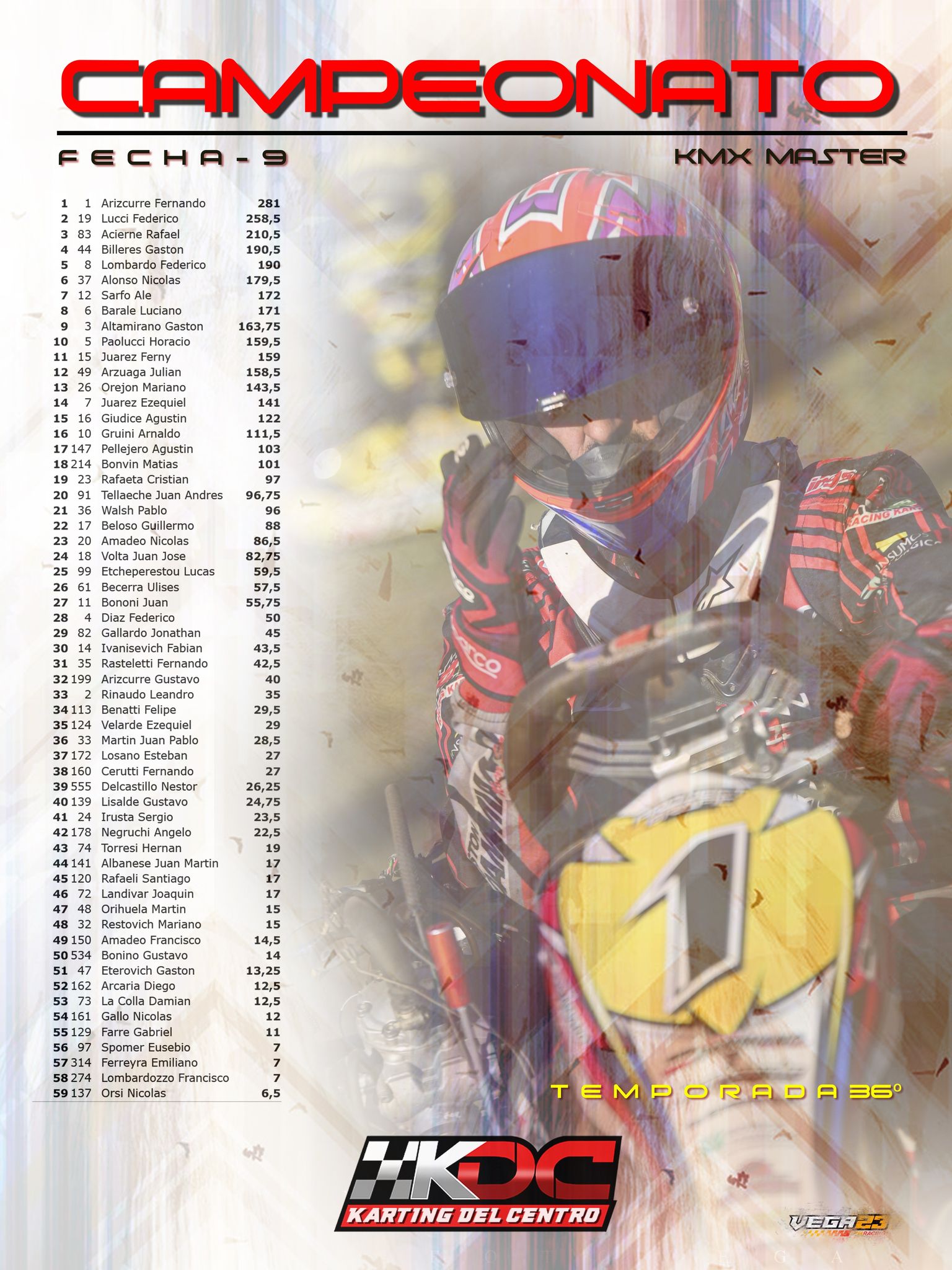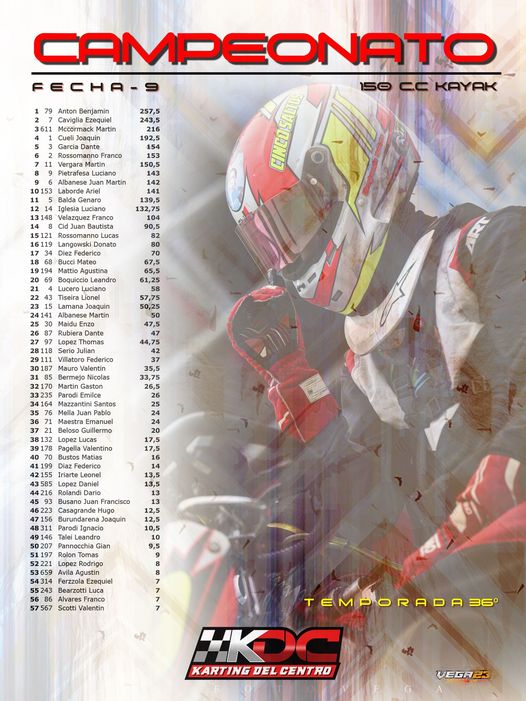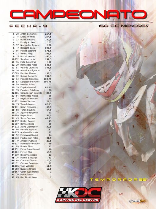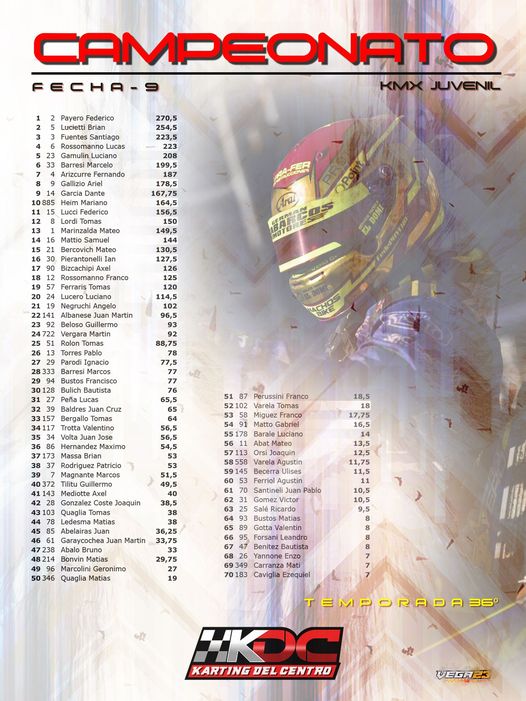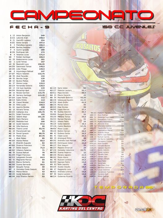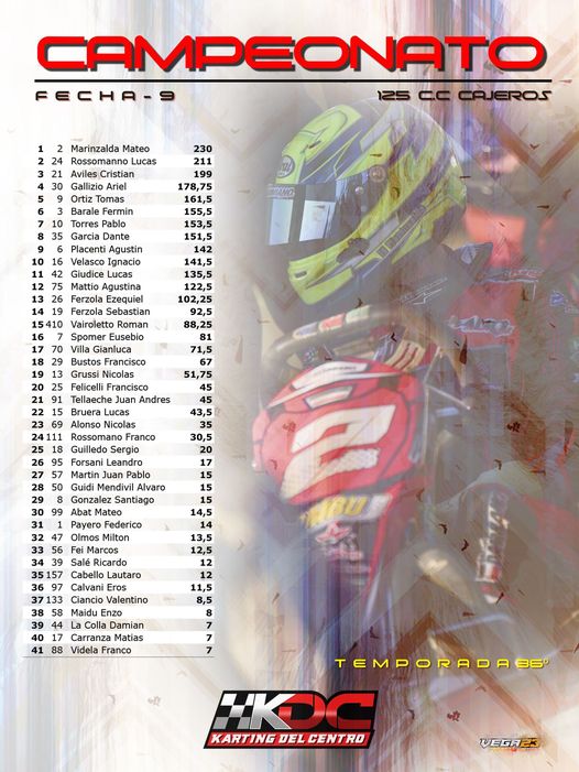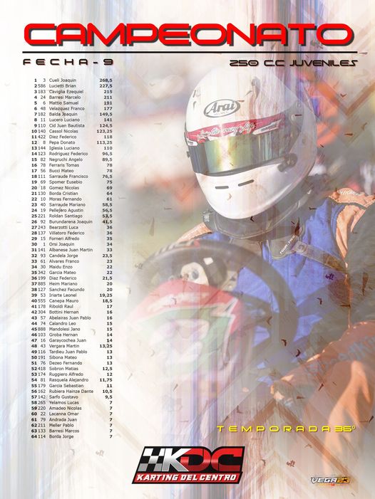 Con 9 fechas realizadas, 25 de Mayo será el cierre. En la clase 250 juvenil Joaquín Cueli es el puntero del certamen con 268,50 puntos, aventajando por 41 unidades a su más inmediato escolta, Brian Lucietti con 227,50. Buenas chances para Joaquín que llega con una aceptable diferencia teniendo en cuenta los 69 puntos que aún hay en juego.
