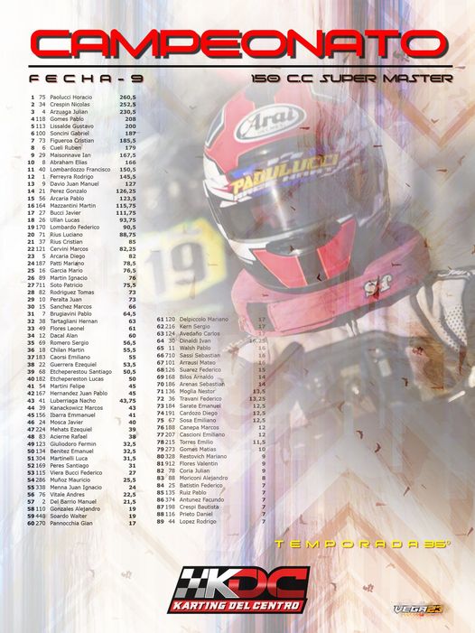 En cuanto a la clase Súper Master, el líder y candidato al título es el casarense Horacio Paolucci con 260,50 puntos, en esta clase esta octavo el trenquelauquense Rubén Cueli con 179 unidades.