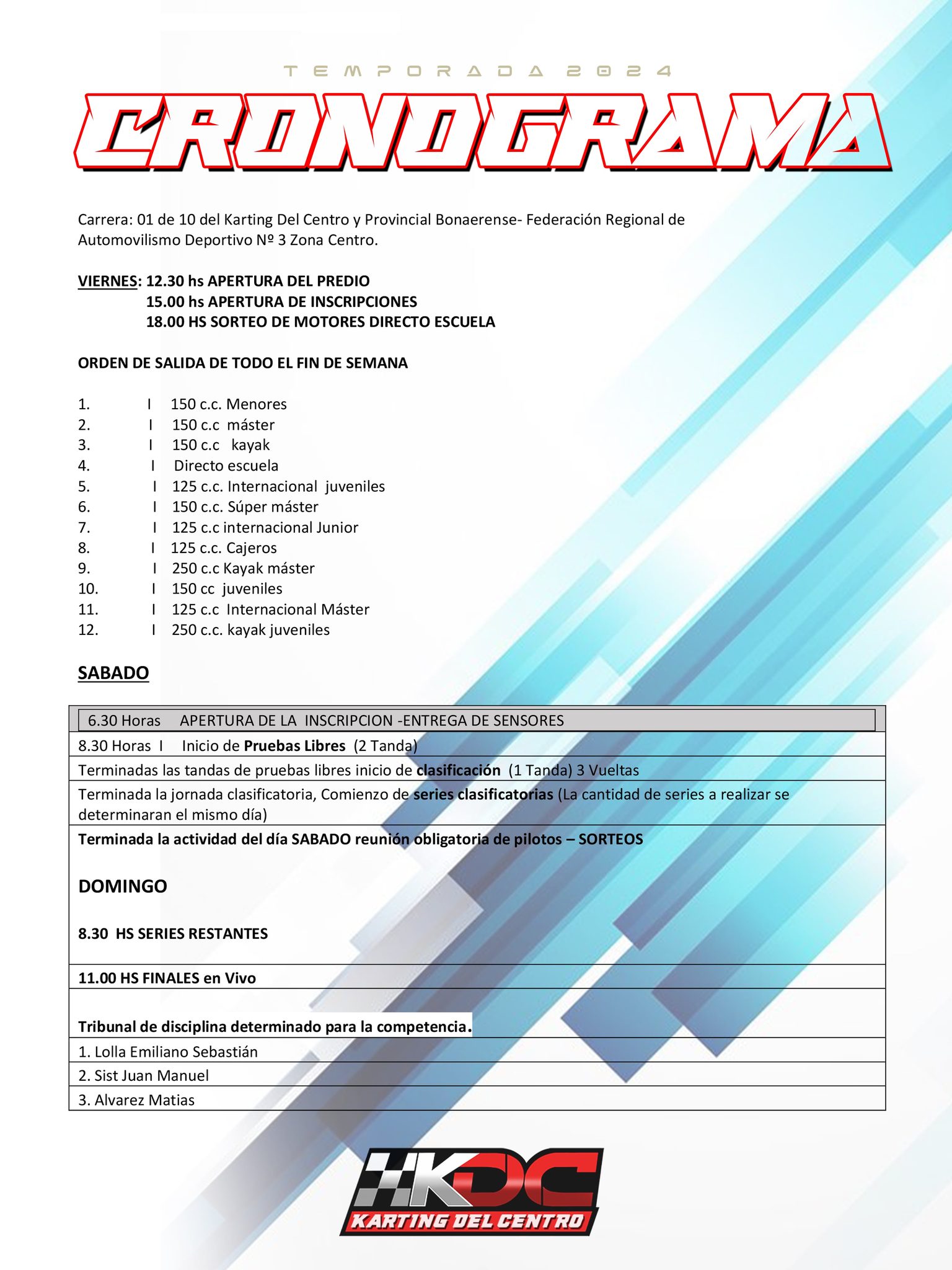 Luego de cambio de escenario y un par de postergaciones, estamos en condiciones de decir, si el clima no dispone lo contrario, que este fin de semana será el inicio del campeonato 2024 del Karting del Centro, en el circuito de la ciudad de 25 de Mayo.