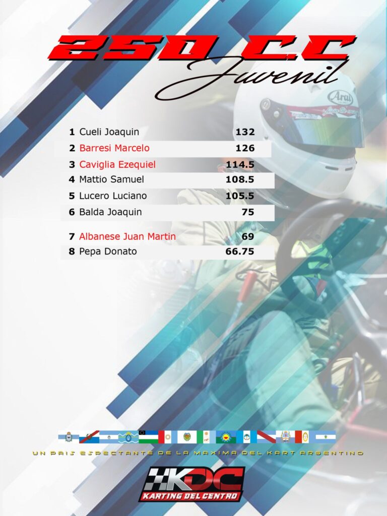 El trenquelauquense Gaston Cueli lidera el certamen de la Kayak 250cc Juveniles con 132 puntos, aventaja por seis a Marcelo Barresi y tercero esta Ezequiel Caviglia con 114,50.