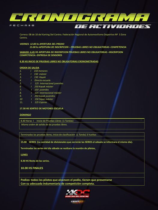 Ya se palpita una nueva cita, un nuevo y atrapante espectáculo del Karting regional, con la octava fecha del Karting del Centro a disputarse los días 14,15 y lunes 16 de octubre en el circuito de la ciudad de 9 de Julio.