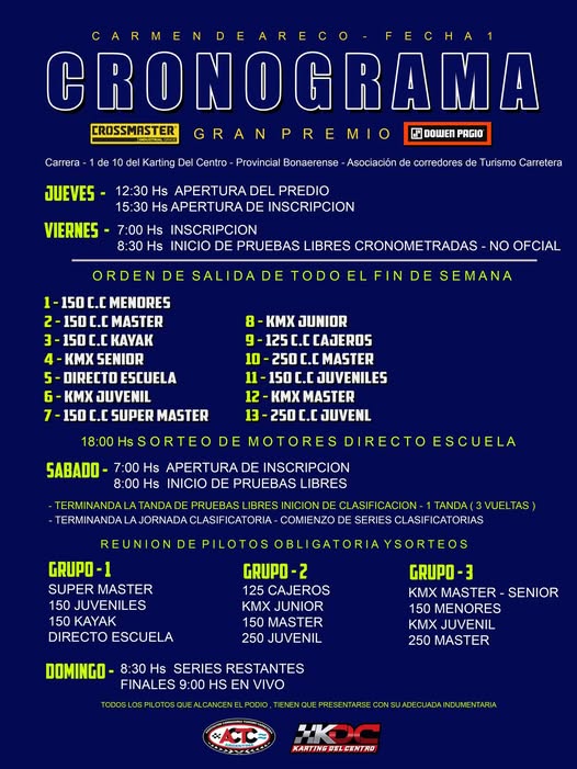 Abierta la inscripción para la primer fecha del año y la definición del campeonato provincial bonaerense 2024 a disputarse el próximo 21, 22 y 23 de febrero en el kartodromo de la localidad de Carmen de Areco donde se pondrá en juego la COPA NACIONAL KDC DOWEN PAGIO- CROSSMASTER y además todos los que formalicen la confirmación de asistencia por medio de la web oficial de la categoría, participan del sorteo de muchos premios, además de conseguir los primeros puntos que se pondrán en juego en esta fecha. Recuerden que en esta fecha se estará realizando el sorteo están del gran premio de Viviendas industrializadas MERAKI y de la fábrica de chasis PBK RACING.