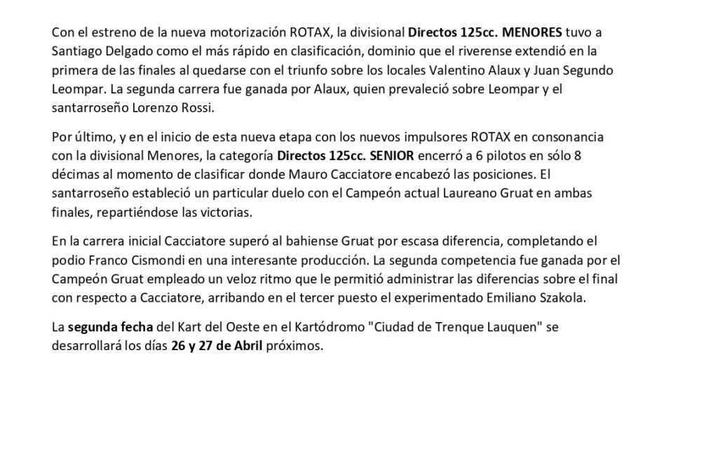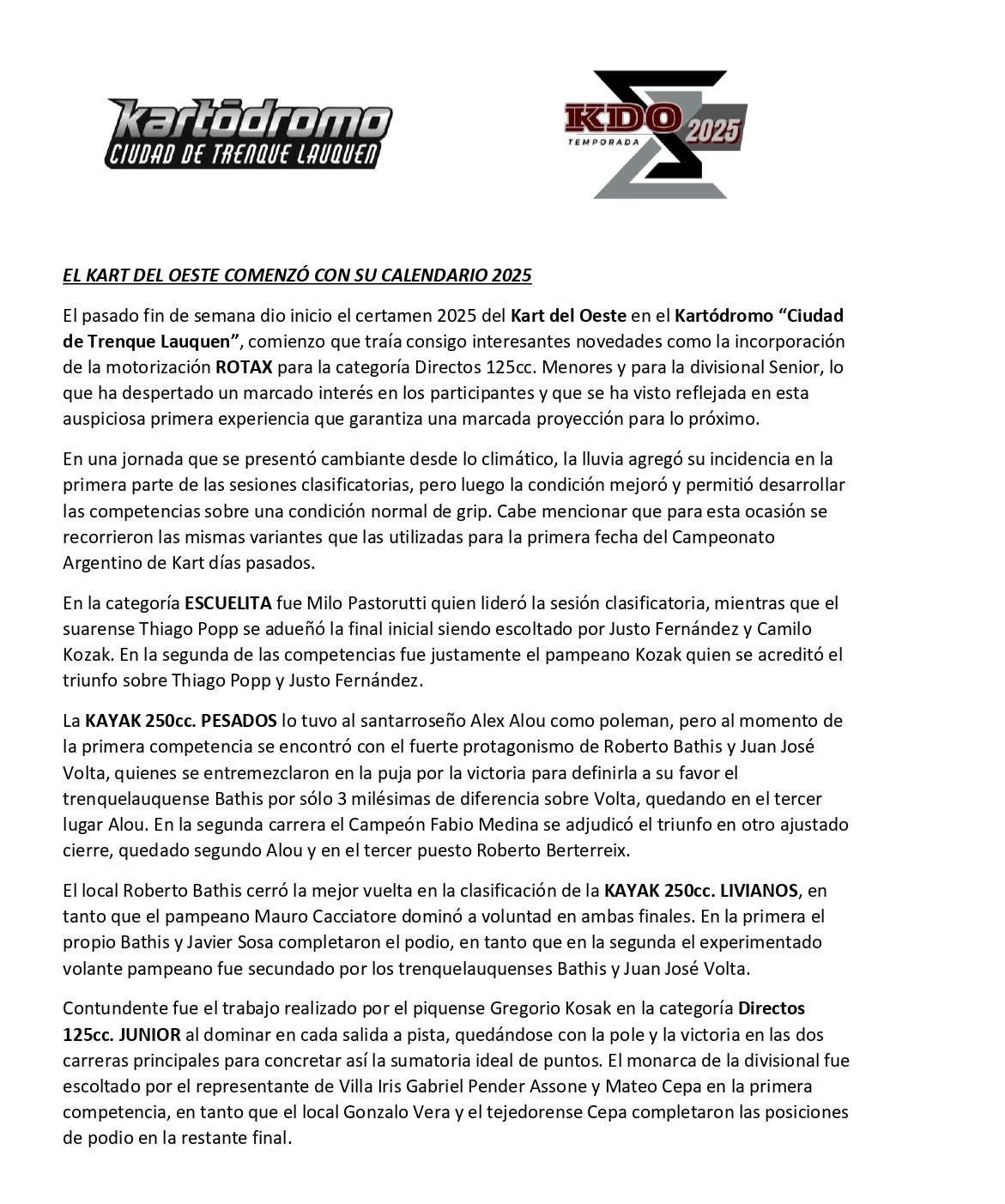 KARTING TORNEO KARTING DEL OESTE 2026 LA SEGUNDA FECHA DEL APERTURA ESTE FIN DE SEMANA Por Deportelauquen. El Karting regional volverá a tener actiividad oficial por el campeonato 2026 del Karting del Oeste el próximo 18 y 19 de abril. En el kartodromo del Gigante de...