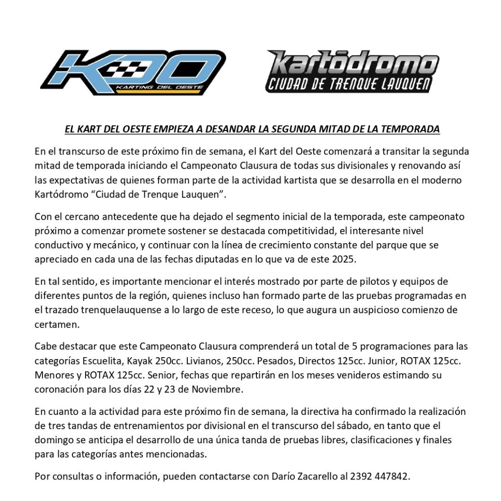 Se confirmo que la 5ta fecha del certamen 2025 del Karting del Oeste se ralizará el 19 y 20 de julio, en el Kartodromo Ciudad de Trenque Lauquen.