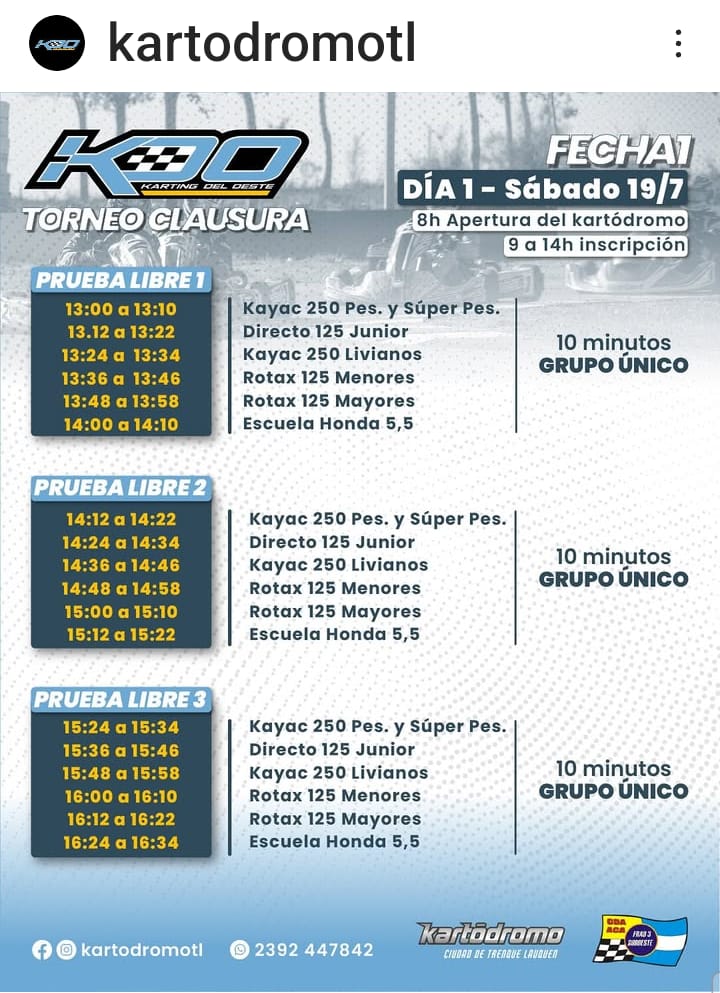 La actividad arrancará este sábado con pruebas libres en tres tanda y grupos únicos de 10 minutos. Las salidas serán a partir de las 13 hs, 14,12 hs y 15,24 hs.