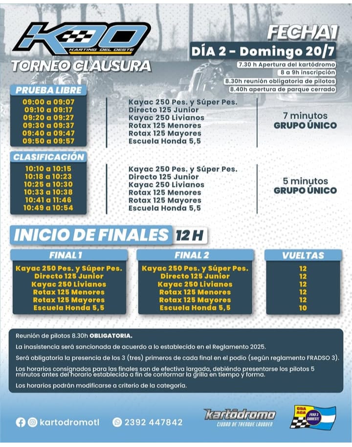La actividad oficial será desde la 12 hs con la disputa de dos finales por categoría, con un desarrollo de 12 vueltas cada una, excepto la categoría Escuela –en un segundo trazado- que disputará carreras finales a 10 giros.
