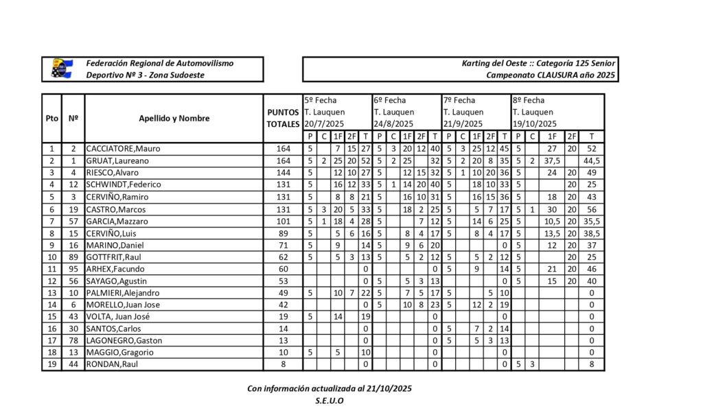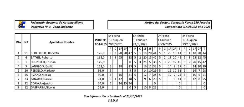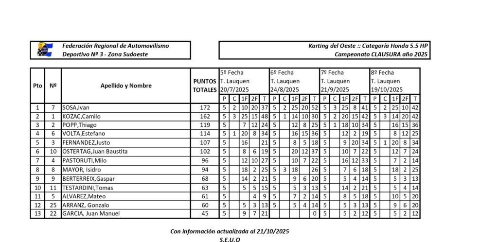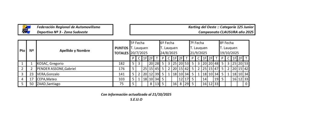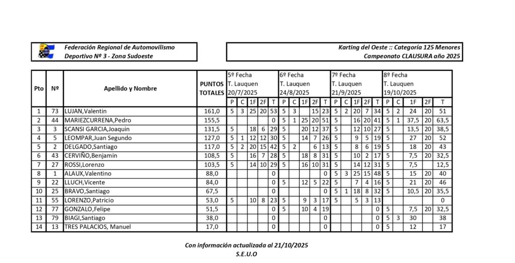 Las clases del Karting del Oeste resolverán sus campeones en la actual etapa del CLAUSURA 2025 en la última fecha, en el mes de noviembre. Disputada la etapa cuarta en octubre, todas divisionales se resolverán en la fecha coronación.