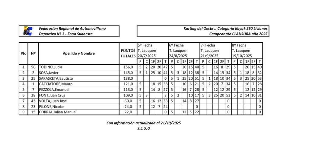 En la Kayak 250cc Livianos lidera la piloto riverense Lucia Todino con 156, segundo esta Javier Sosa con 145 y tercero Bautista Sarasketa con 138.